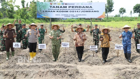JOMBANG | BangkitNusantaraNews.id – Komitmen Kabupaten Jombang dalam mendukung ketahanan pangan nasional kembali dipertegas. Pada Sabtu (3/1/2026), Bupati Jombang, Warsubi S.H., M.Si, Wakil Bupati Jombang Gus Salmanudin, S.Ag., M.Pd., bersama Dandim 0814 Jombang, Letkol Kav Dicky Prasojo, SH., M.Han., dan segenap Forkopimda Kabupaten Jombang, Budi Suparmin Komisaris PT Sinergi Gula Nusantara (SGN), General Manager PG Tjoekir, petani melakukan peluncuran (launching) penanaman tebu perdana di lahan milik Kodim 0814 yang berlokasi di wilayah Koramil Diwek.