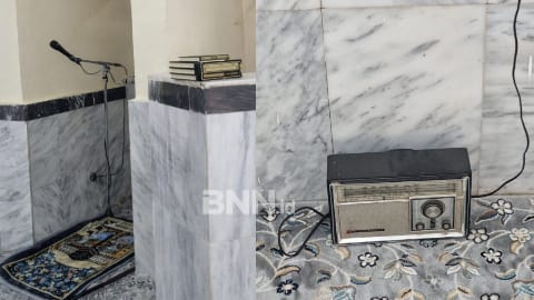 Di salah satu sudut mihrab, tampak sebuah radio antik.