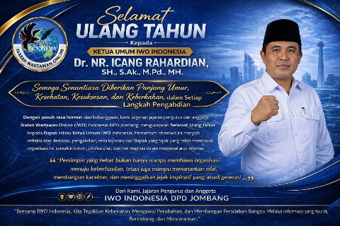 JOMBANG | BangkitNusantaraNews.id – Ikatan Wartawan Online (IWO) Indonesia Dewan Pimpinan Daerah (DPD) Jombang menyampaikan ucapan selamat ulang tahun kepada Ketua Umum IWO Indonesia, Dr. NR. Icang Rahardian, SH., S.Ak., M.Pd., MH.